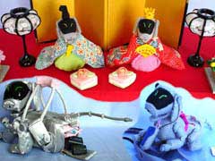 「AIBO雛」と、 左下が「カメラ用品ケース」 右下が「メモリースティックケース」 |